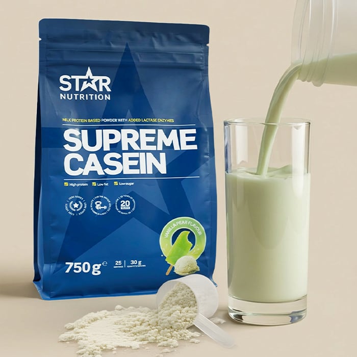 Kasein får en tykkere konsistens enn myse og er derfor populært som mellommåltid eller før leggetid. Supreme Casein fra Star Nutrition er et markedsledende kasein fremstilt av melkproteinkonsentrat. Et herlig kremet protein som gir 25 g protein per scoop og inneholder laktaseenzym.